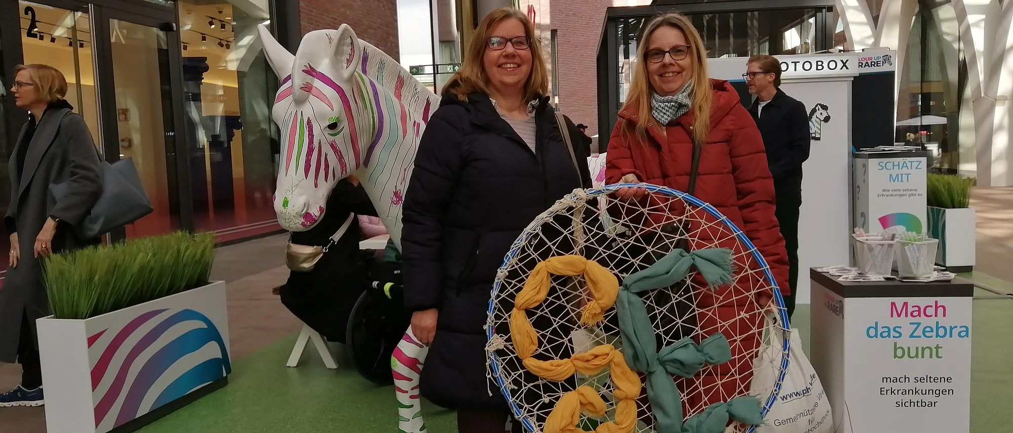 Dennoch waren Jutta Gläser und ich nicht ganz umsonst dort, denn auch der Verein ACHSE e.V. hatte einen Stand im Center, und hat im Rahmen der Kampagne #ColourUP4RARE und einem bunten Zebra ein farbenfrohes und kraftvolles Zeichen für Sichtbarkeit, Solidarität und Aufmerksamkeit für Menschen mit Seltenen Erkrankungen gesetzt.