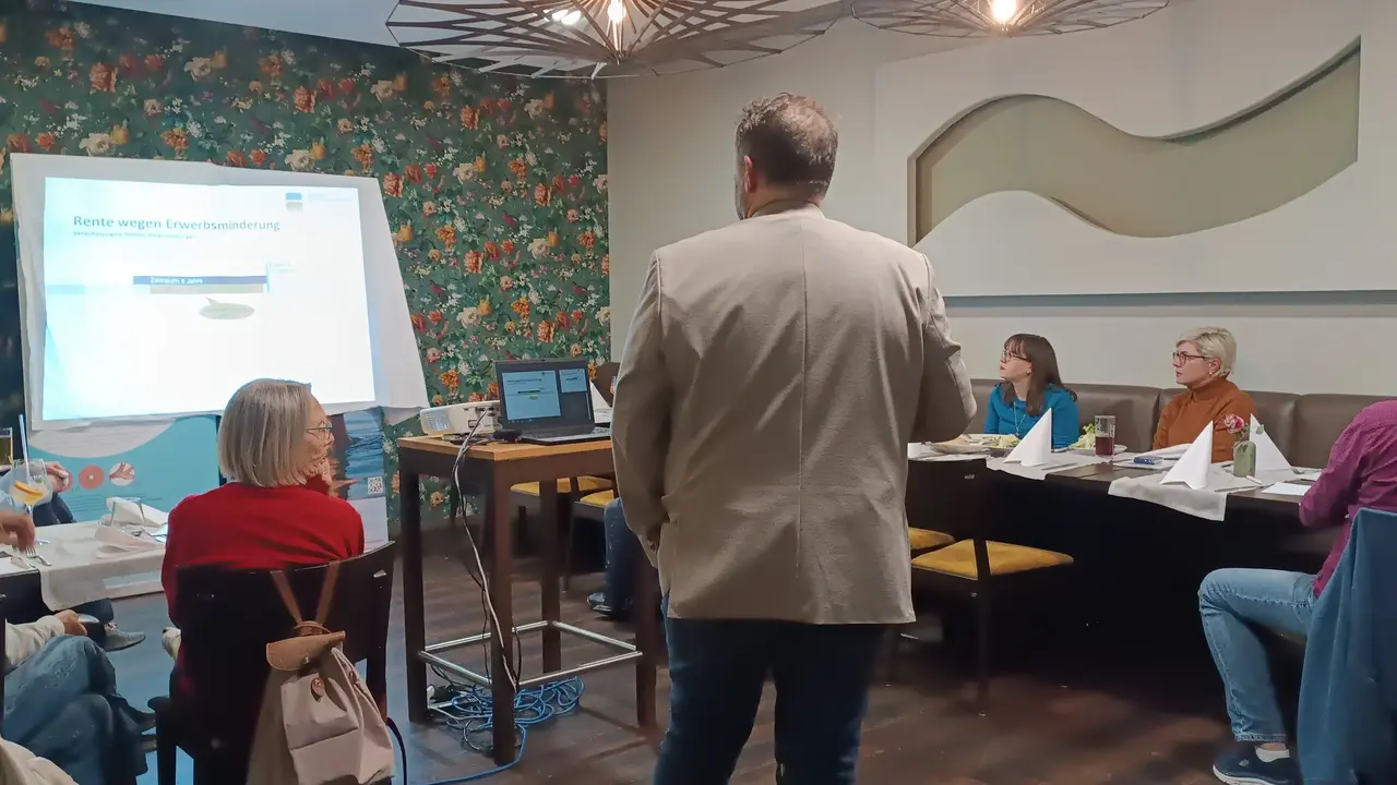 Herr Kutzke führte uns mit anschaulichen Projektor Erklärungen durch das komplexe Thema Erwerbsunfähigkeitsrente (EU-Rente). Viele Fachfragen konnten allgemein in unserer Gruppe oder vertraulich im Einzel Gespräch beantwortet werden. Danach verabschiedeten wir Herrn Kutzke mit einem kleinen Präsent in sein verdientes Wochenende.